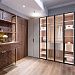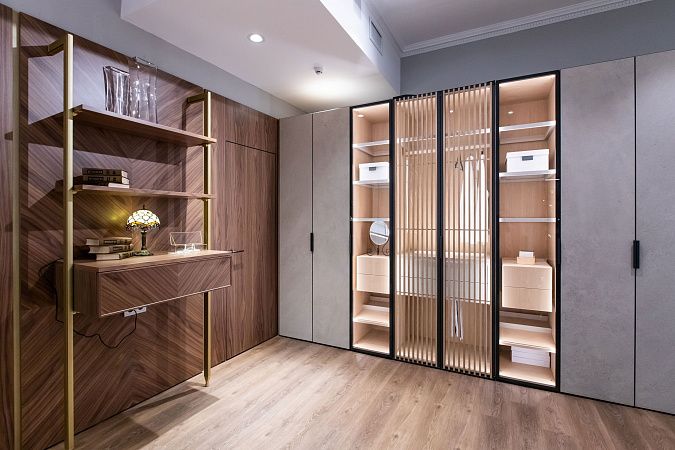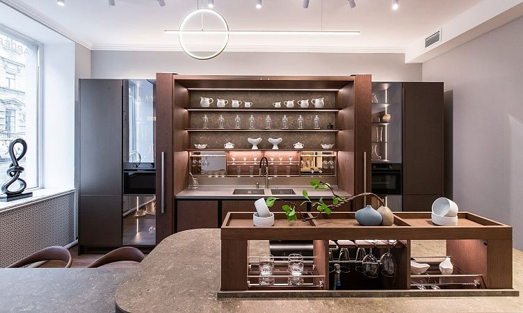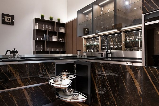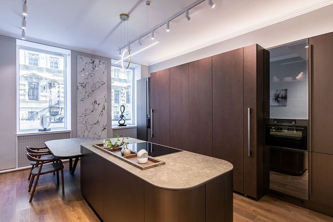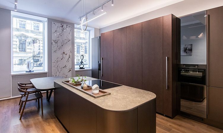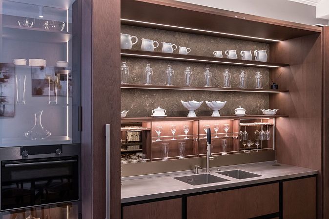 Современные элементы в нержавеющей стали гармонично соседствуют с классическими филенчатыми фасадами в шпоне, резным декором из натурального дуба. Функциональность обеспечивают современные решения: механизмы на электроприводах, декоративная подсветка, управление которой возможно взмахом руки, вместительное хранение.