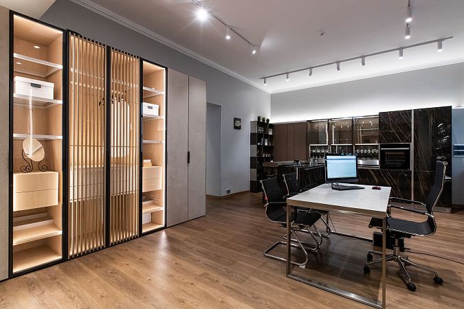 Умные механизмы и диалог фактур: новый образец кухонной мебели в салоне на ул.Гагаринская