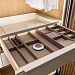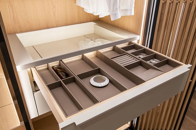 Верхний ящик для аксессуаров укомплектован органайзерами из экокожи. Стеклянное основание позволяет видеть содержимое, а скрытые направляющие сохраняют безупречный вид при открывании.