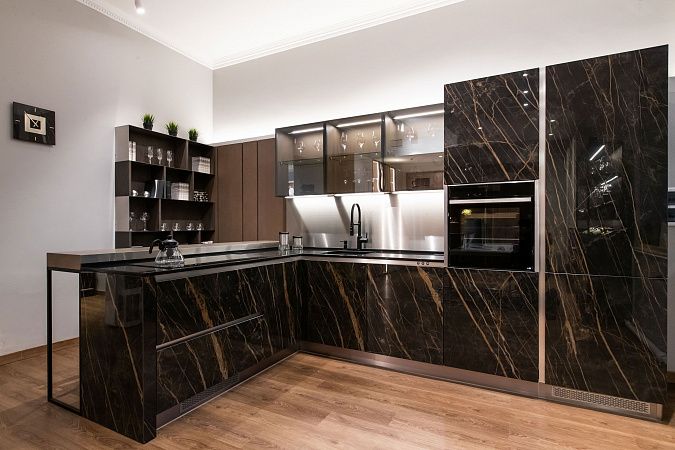 Практичность и стиль подчеркивает столешница и стеновая панель из керамики Inalco Brenta Marron, выбранная за высокую износостойкость и гармонию с фасадами под металл.