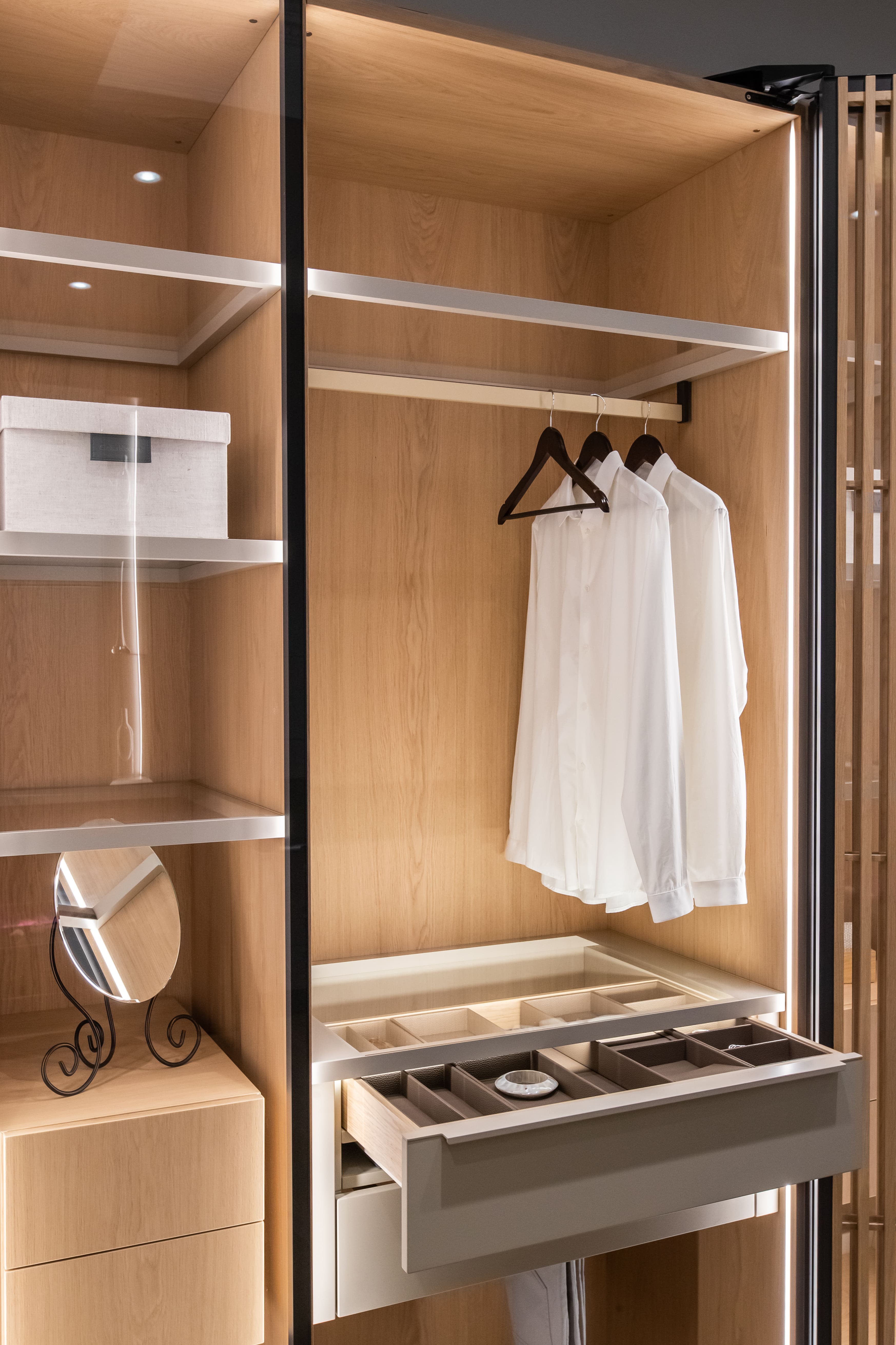 Верхний ящик для аксессуаров укомплектован органайзерами из экокожи. Стеклянное основание позволяет видеть содержимое, а скрытые направляющие сохраняют безупречный вид при открывании.