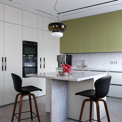 Кухня сделана максимально нейтральной и не сразу открывается взгляду — это было основное пожелание клиентов. Чтобы кухня «растворилась» в гостиной, авторы проекта применили ряд приёмов: закрытые верхние шкафы встроены заподлицо с плоскостью стены и схожи с ней по цвету; раздвижной «фартук» скрывает систему хранения, благодаря которой все предметы, обычно находящиеся на рабочей поверхности, могут быть убраны. Часть кухонных стеллажей со встроенной бытовой техникой «спрятана» за несущей стеной лоджии — из гостиной их совершенно не видно.