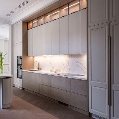 Угловую кухню в нейтральной серо-белой гамме расположили вдоль окна, подоконник которого использовали как продолжение рабочей поверхности. Верхние фасады выполнены из керамики, имитирующей натуральный мрамор.